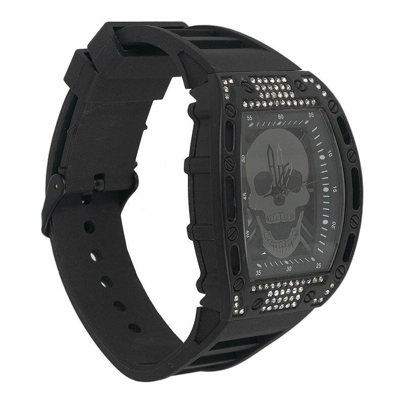 The Ed Hardy watch with skull dial is a stylish edgy watch designed to reflect the unique style of streetwear designer Ed Hardy and the iconic t-shirts he is known for. This adult watch is encircled by a metal case that frames a skull dial with markers set atop it. The watch is powered by a quartz movement and comes paired with a multifunctional plastic strap completing its menacing look. Whether you re a fan of streetwear culture or looking for the perfect gift for a daring loved one the Ed Hardy watch makes a bold statement that never fails to catch an eye.