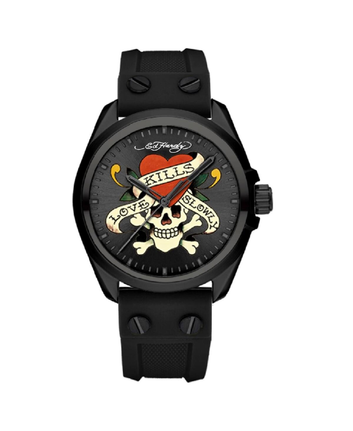 The Ed Hardy Love Kills Slowly print artwork dial analog watch is a stylish and eye-catching timepiece featuring a unique design. The round watch face is the perfect canvas for the colorful and vibrant art framed with a sleek black bezel. It features a quartz analog movement with a second-hand and minute-hand. The black silicone strap offers a comfortable and secure fit and the metal case and buckle also make it wear-resistant and durable enough for everyday use. Perfect for standing out from the crowd this stylish timepiece is sure to make a fashionable statemen