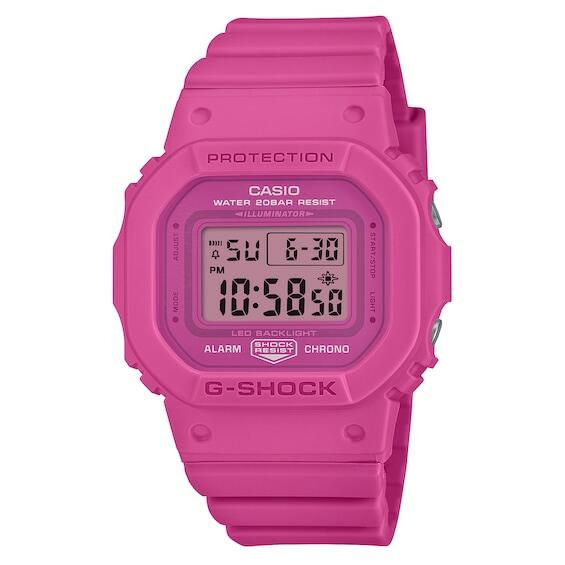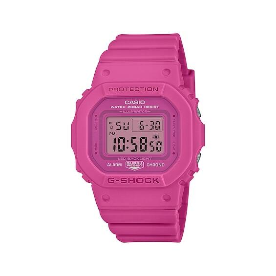 This G-Shock Breast Cancer Research Foundation watch embodies the Casio commitment to pink ribbon campaigns which raise awareness of the importance of early detection diagnosis and treatment of breast cancer. G-shock and Pink Ribbon are natural allies sharing a dedication to building a world where everyone can be healthy is free to be themselves and never misses out due to illness. Case size (L? W? H): 45.7 ? 40.5 ? 11.9 mmConstruction: Shock ResistantCase and bezel material: Resin / Bio-based resinBand: Bio-based resin band200-meter water resistanceMineral Glass1/100-second stopwatchCountdown timerMulti-function alarmHourly time signalFlash alert: Flashes with buzzer that sounds for alarms hourly time signals countdown timer time up alarmLED backlight (Super Illuminator) AfterglowFull auto-calendar (to year 2099)12/24-hour formatRegular timekeeping: Hour minute second pm month date dayCasio G-Shock Style #: GMDS5610PK-4
