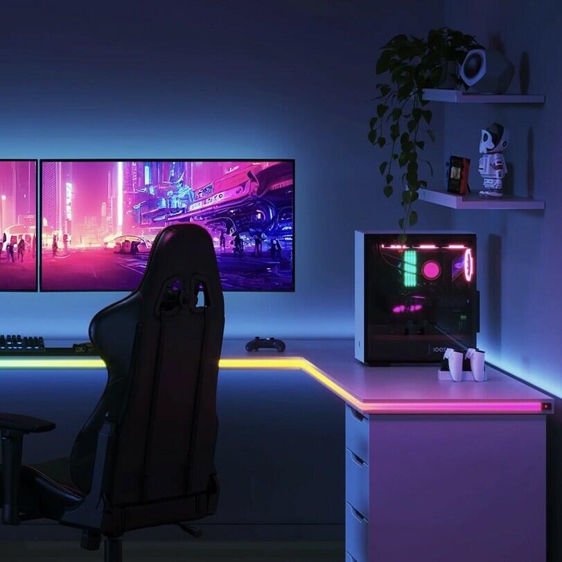 Take your gaming desk to the next level with the Govee Gaming Neon Rope Light. This light easily creates gorgeous lighting effects for more advanced game lighting. Take your gaming desk to the next level with the Govee Gaming Neon Rope Light. This light easily creates gorgeous lighting effects for more advanced game lighting. FEATURES 42 controllable segments customize RGBIC lighting effects. 14 zones per meter, 16.8 million colors and 64+ scene modes Produces a uniform luminous surface by utilizing back-facing LED emission, for seamless & glare-free game lighting. 12 specific cutting points to ensure a perfect fit for most desks. Sync with Gaming Sync Box and Razer Chroma. More smooth and durable. Simple voice commands via Alexa and Google Assistant.WHAT'S INCLUDED Neon Rope Light, Control Box, Adapter, User Manual, Service CardDETAILS 7.68 x 8.27 x 2.99 in 2.03 lbs. Wall plug Manufacturer's 1-year limited warranty For warranty information please click here H61C2AD1 Imported Gift Givers: This item ships in