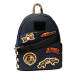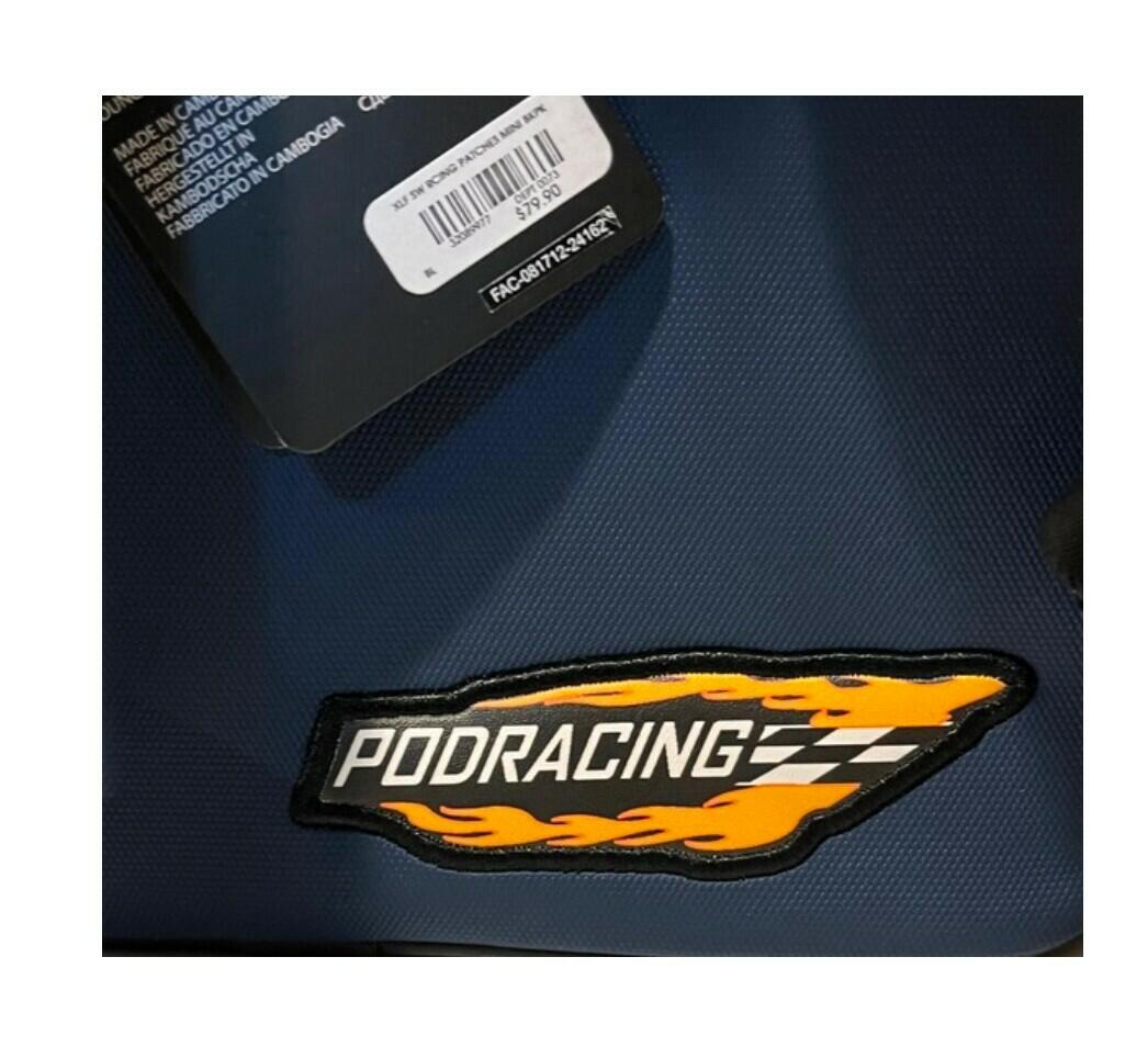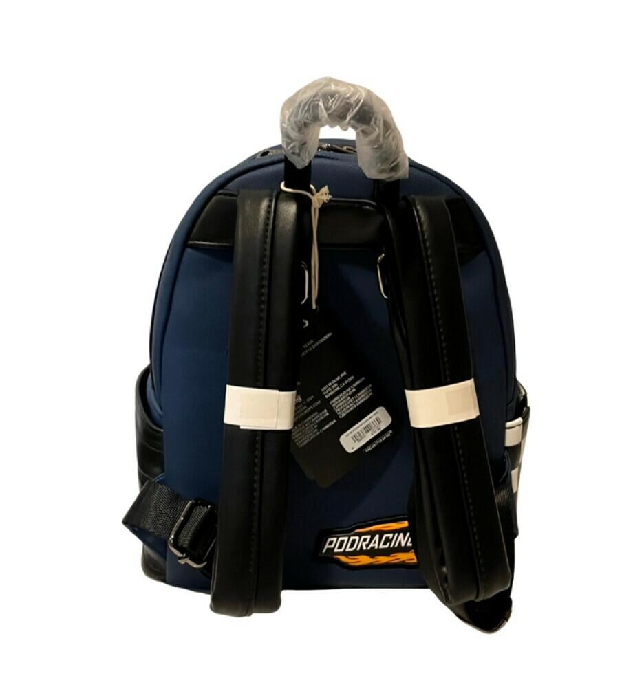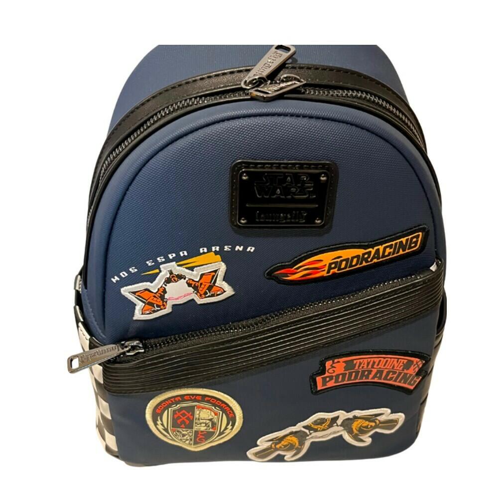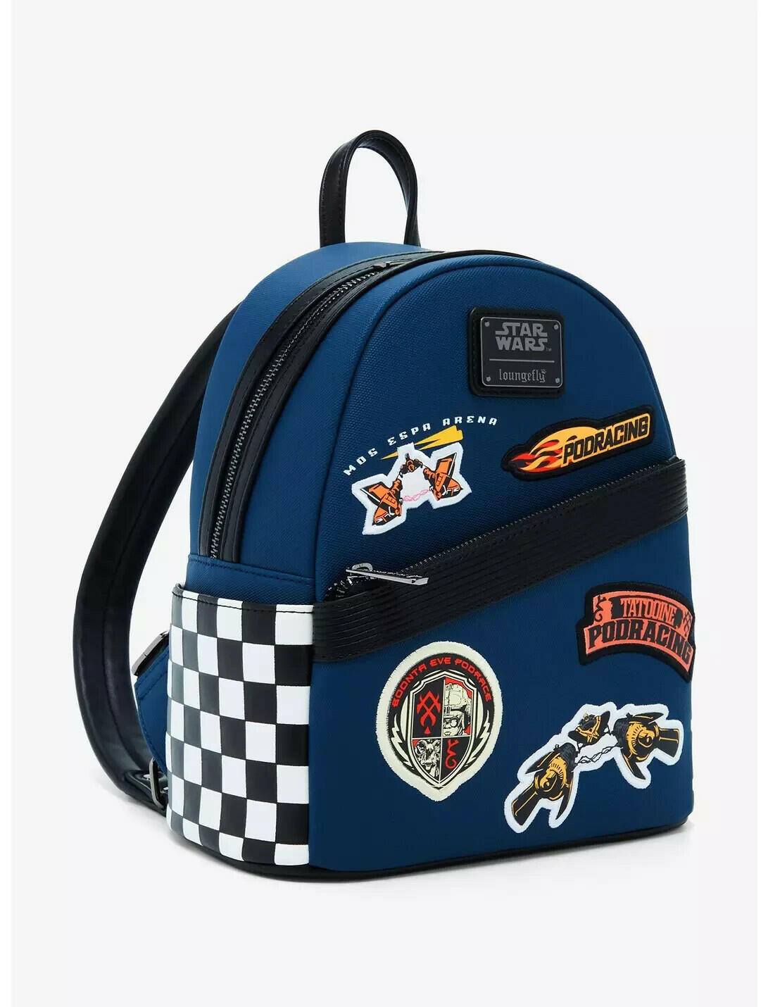 This is a new Loungefly Star Wars Podracing Patches mini backpack in navy, featuring Pod Racing Patches. It has a zip closure with black hardware and black top handle. The interior lining is black and white checkered. This unisex adults' backpack is designed with a Star Wars theme, specifically inspired by the Podracing scenes in the movie.