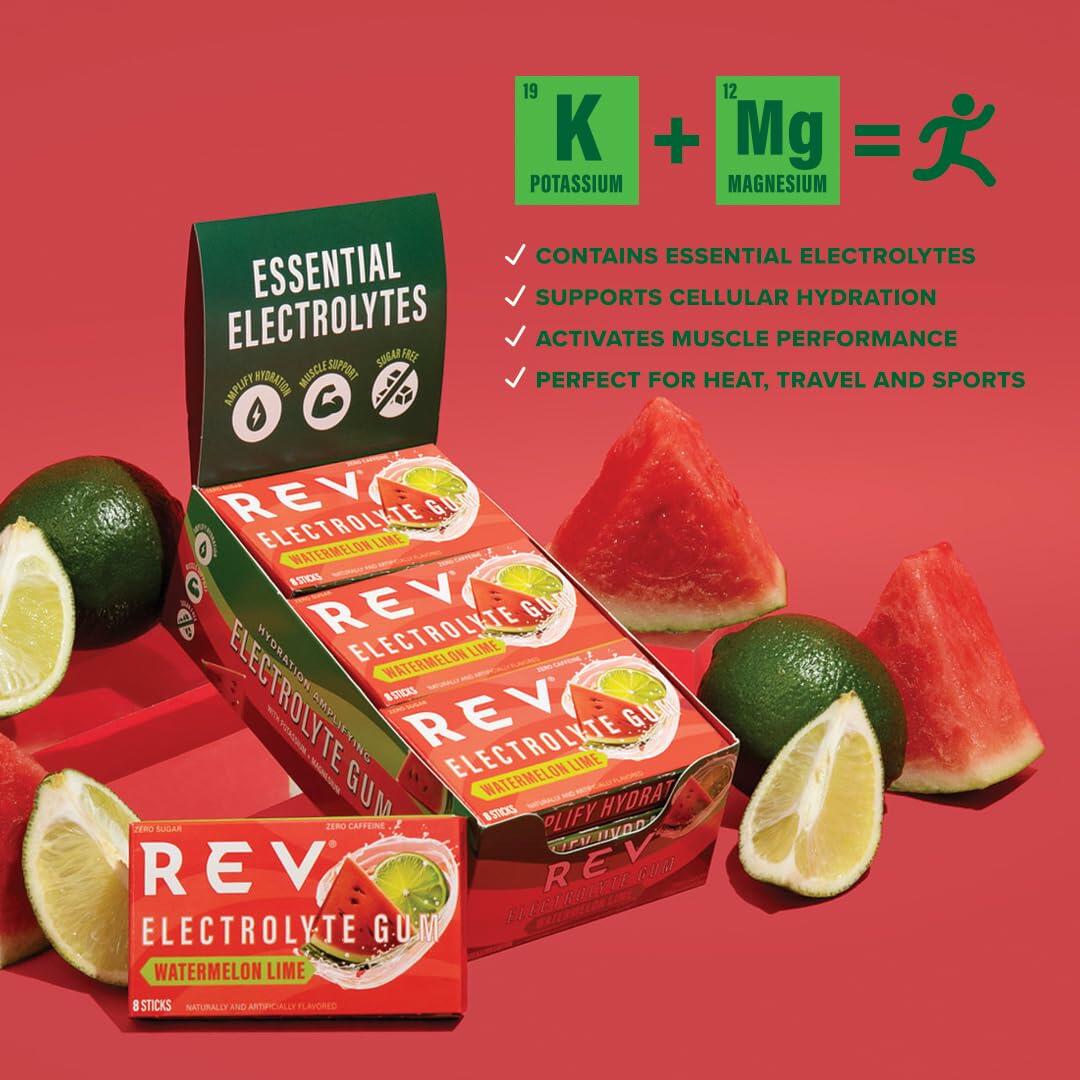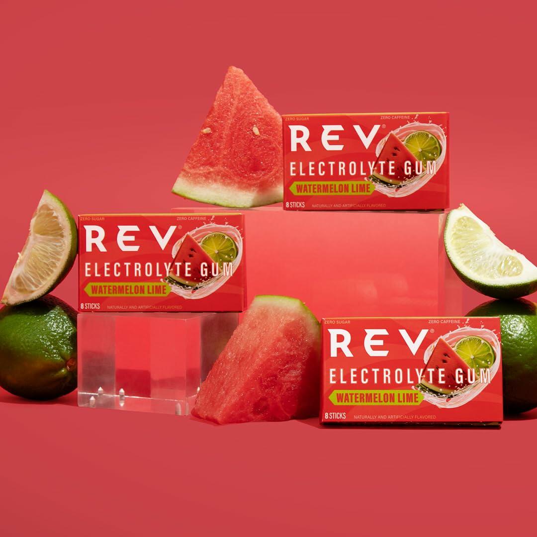 Rev Electrolyte Gum, Watermelon Lime, Sugar-Free with Essential Electrolytes,12 Count