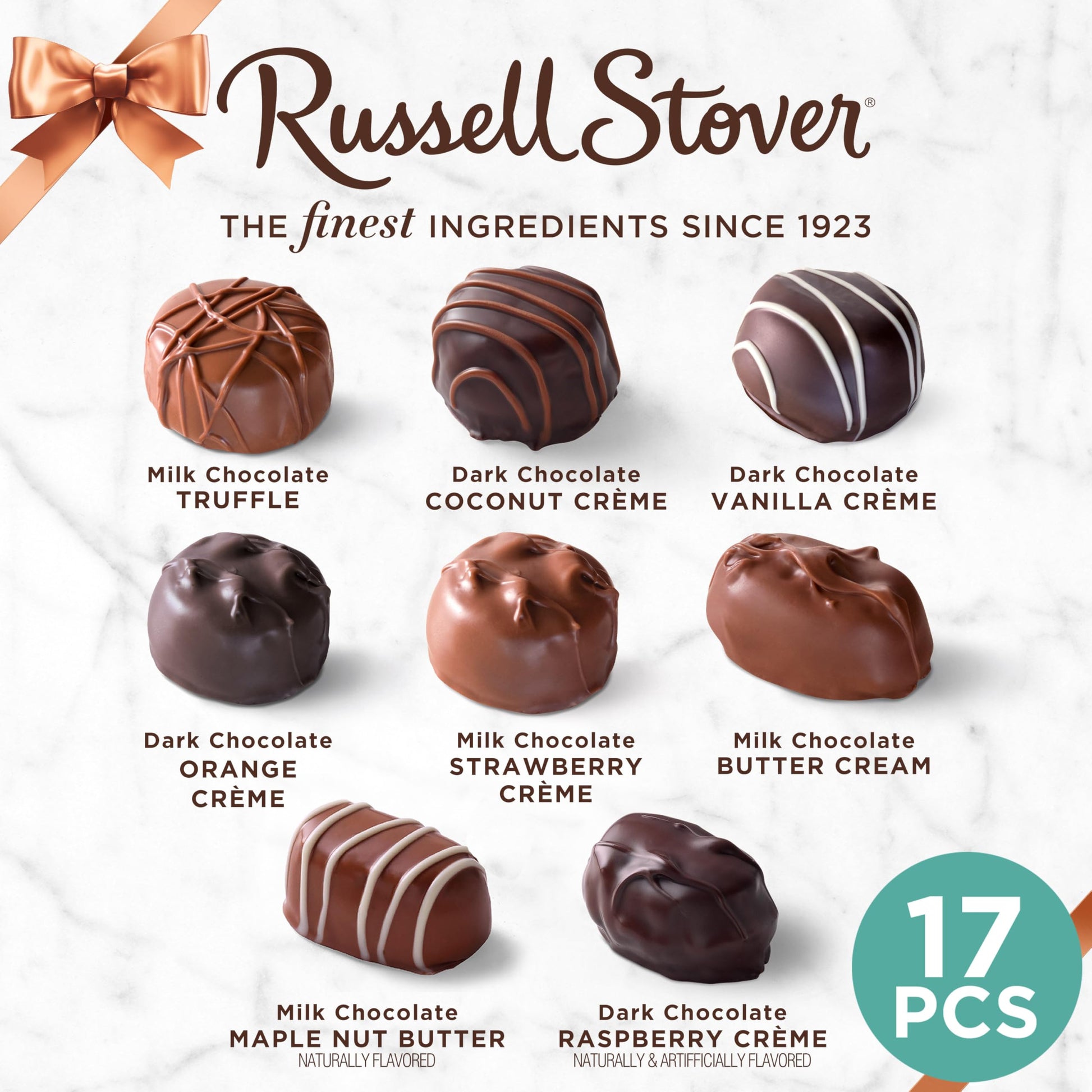 - Creams: The Russell Stover Assorted Creams Gift Box includes milk chocolate butter creams, milk chocolate strawberry creams, dark chocolate vanilla creams, dark chocolate butter creams, and milk chocolate truffles