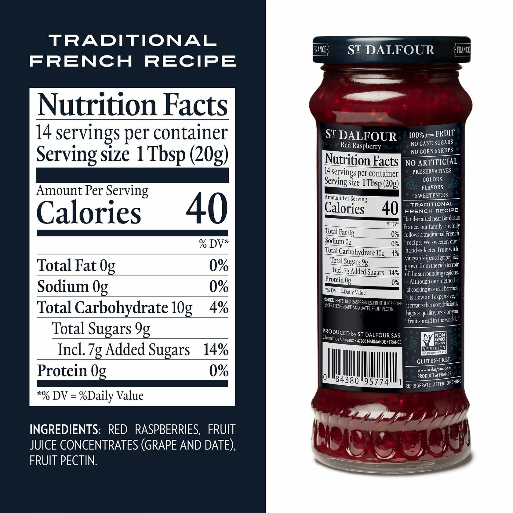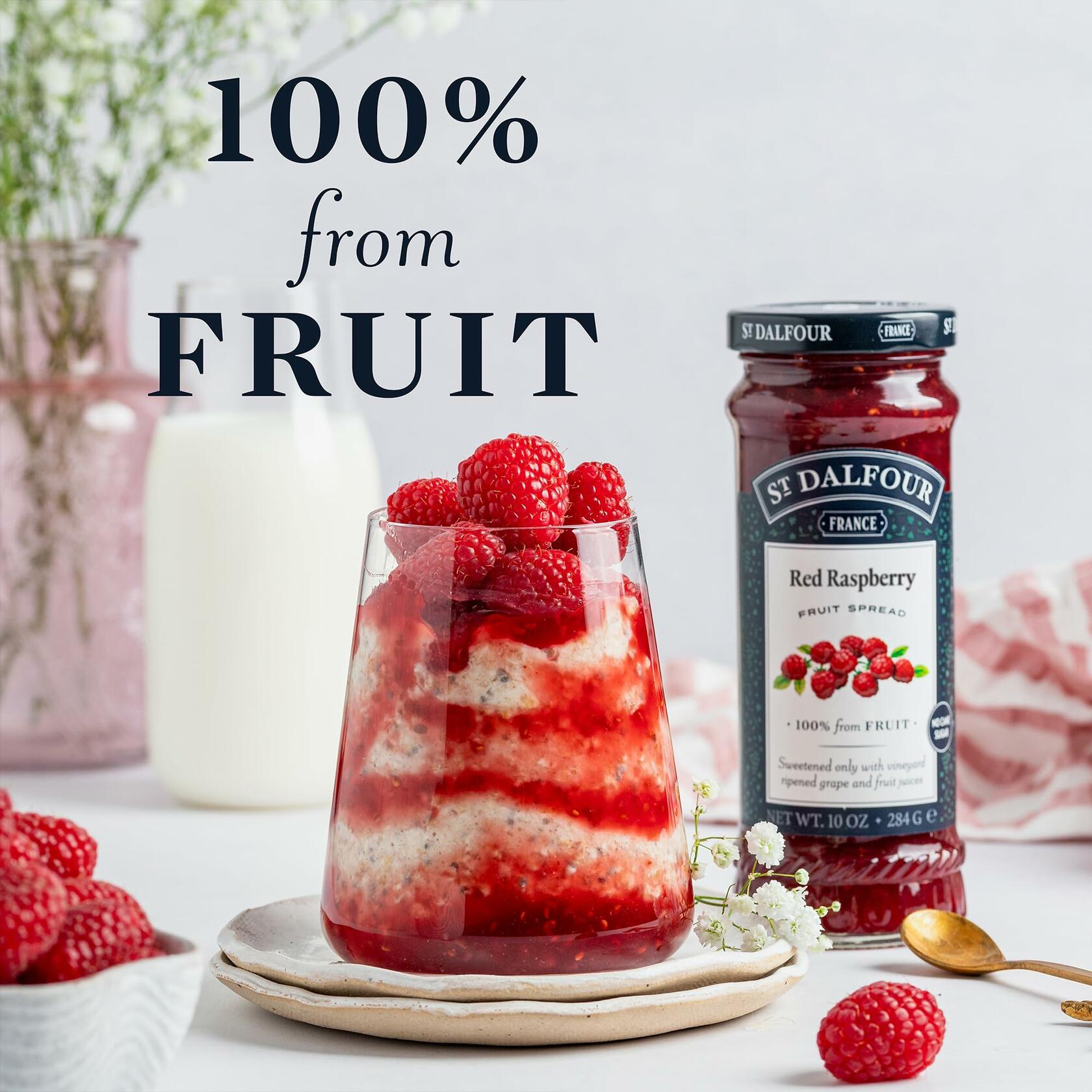 Savor the exceptional taste of St Dalfour Red Raspberry French Fruit Spread, meticulously crafted in France to deliver a rich, authentic flavor experience. Made with 100% fruit, this premium spread captures the vibrant essence of ripe red raspberries, offering a naturally sweet and tangy delight in every bite. Free from synthetic nitrates or nitrites and without artificial additives, this spread is a pure and wholesome choice for health-conscious consumers. Sweetened solely with Fruit Juice Concentrates, it delivers a naturally indulgent sweetness without added sugars. Perfect for enhancing your favorite breakfast or dessert, it adds a gourmet touch to any meal. Sealed in a 10 oz jar to preserve its fresh, bold flavor, this spread ensures every spoonful is as delightful as the first. Elevate your culinary creations with the refined taste and quality of St Dalfour Red Raspberry French Fruit Spread, a true testament to French tradition and expertise.